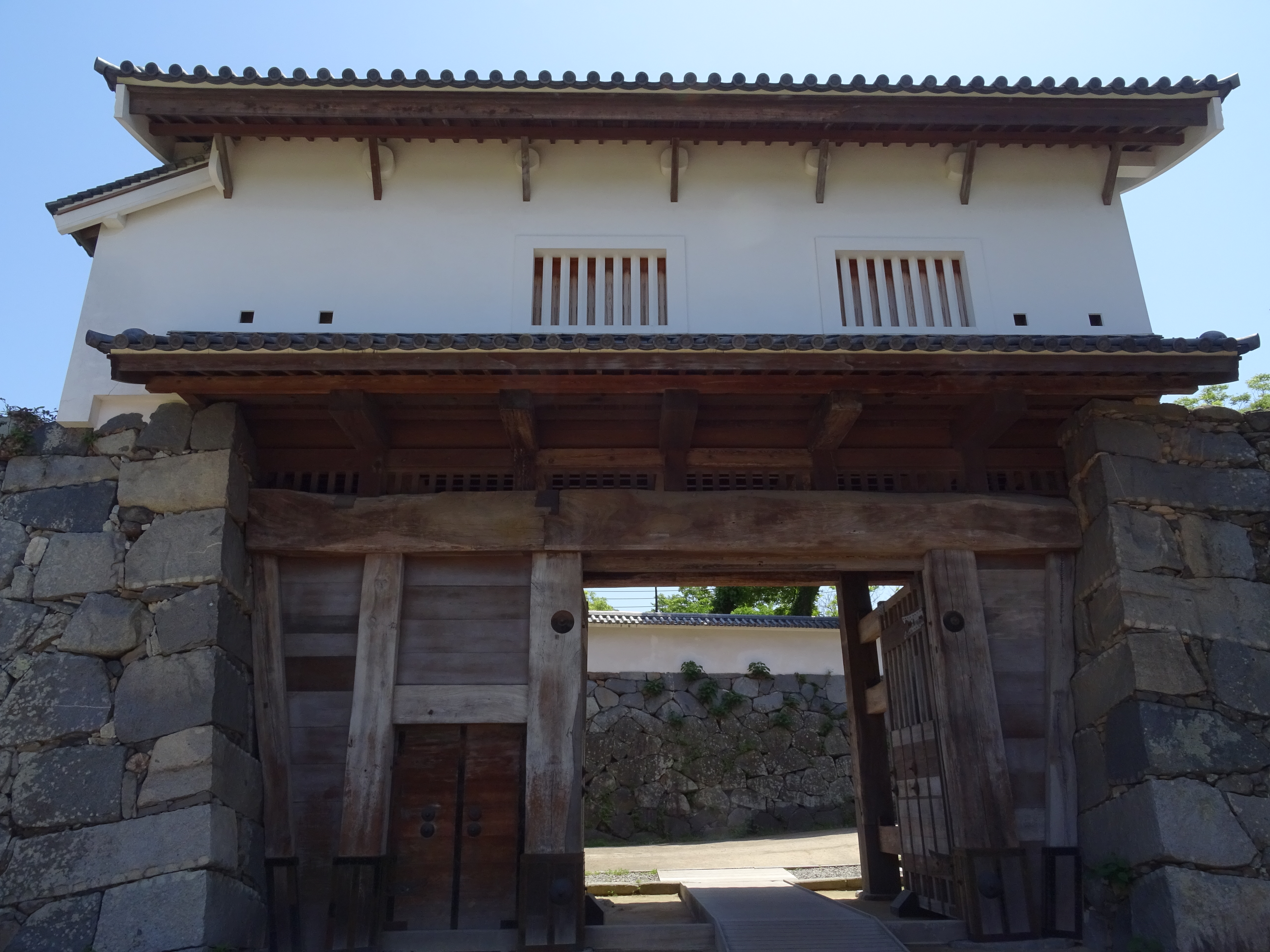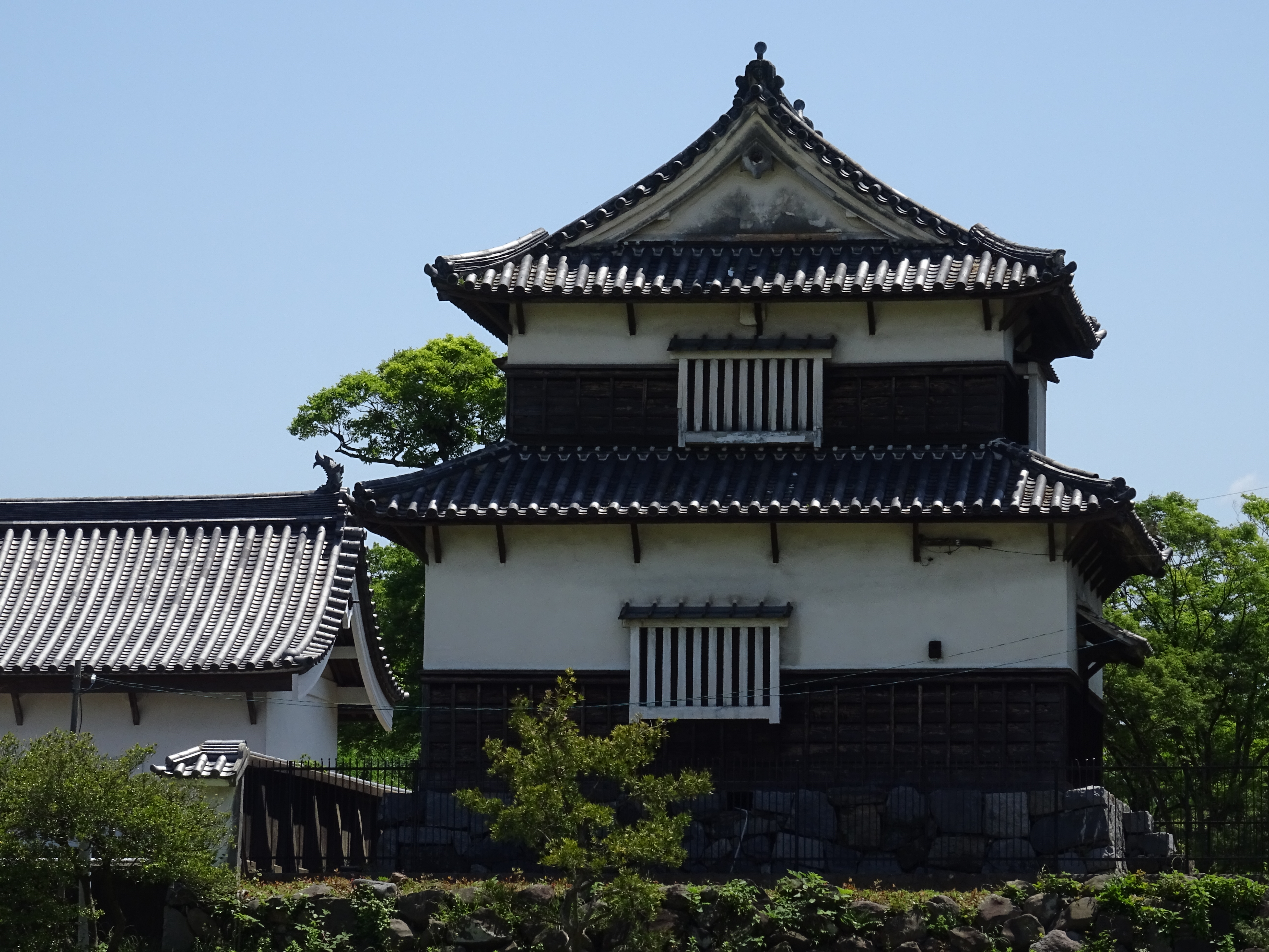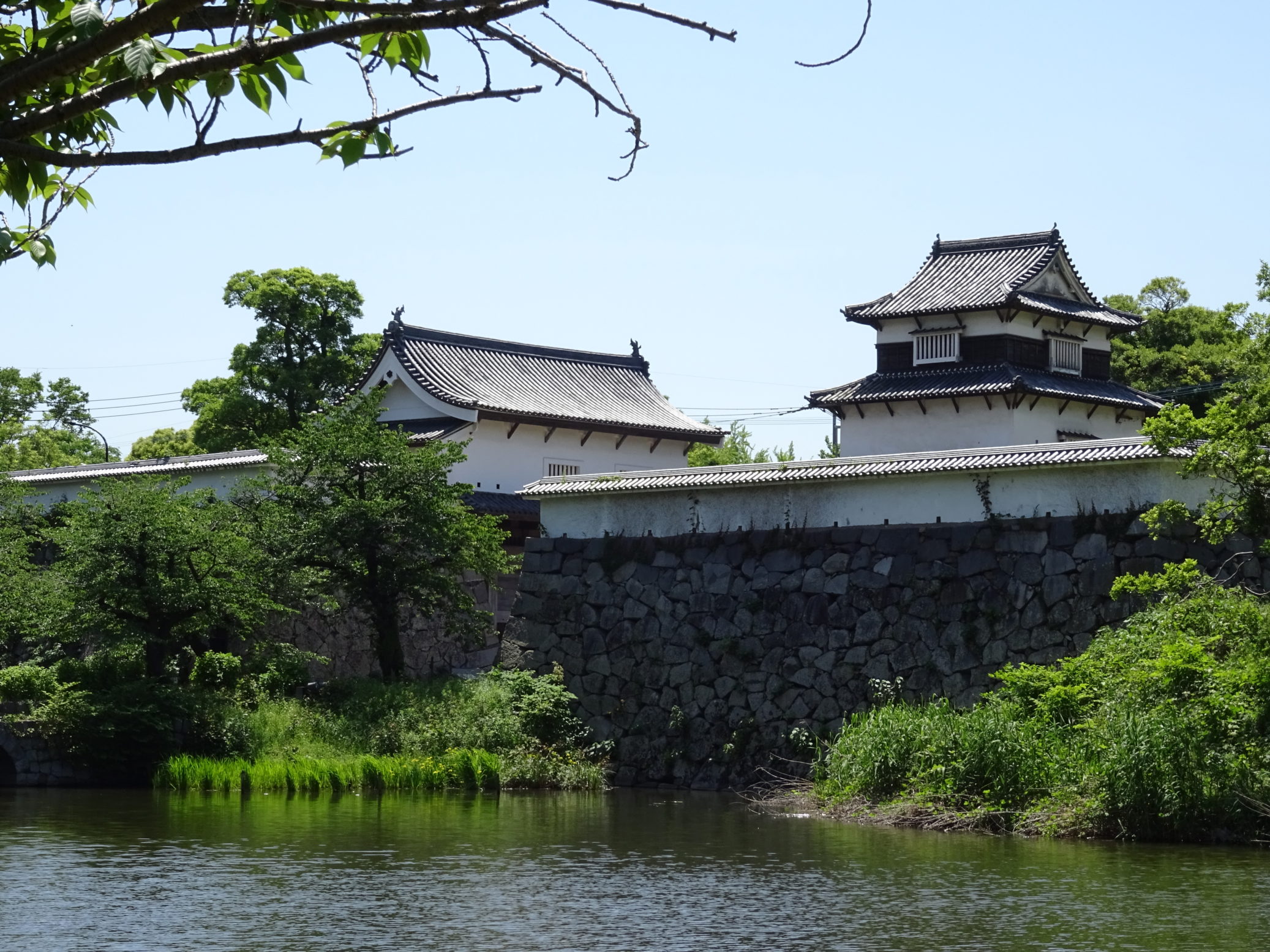 Parmi les quelques bâtiments de château survivant ou reconstruit sont des portes et des tours de garde, dispersées à travers les terres du château. Des parties du système de douves subsistent également, notamment sur la frontière nord du parc Maizuru et devant le grand lac au centre du parc Ohori voisin.