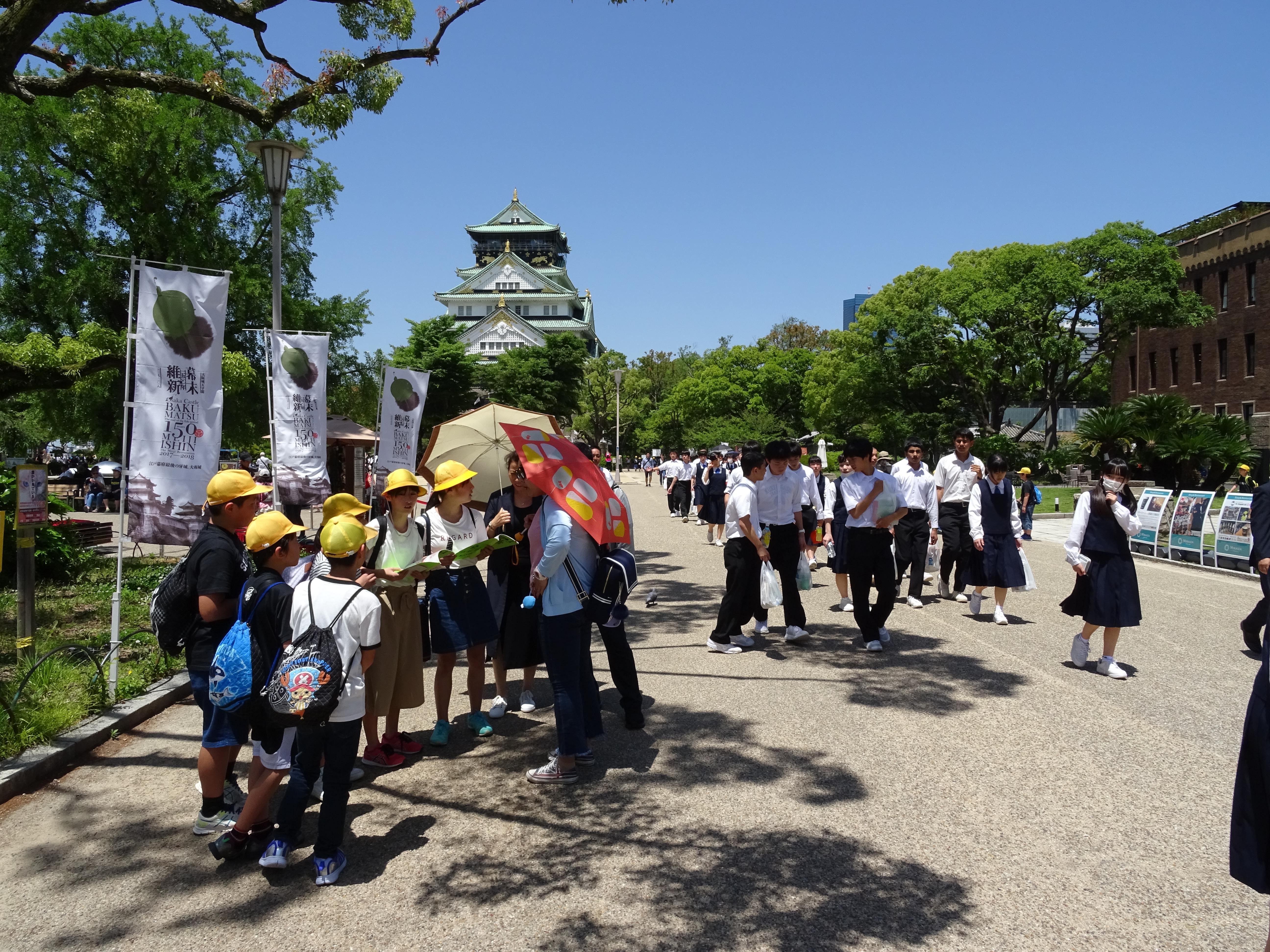 Par ailleurs, l’ensemble du parc du château d’Osaka couvre environ deux kilomètres carrés avec beaucoup d’espaces verts, des installations sportives, une arène polyvalente (Osakajo Hall) et un sanctuaire dédié à Toyotomi Hideyoshi. Le parc est l’un des hanamis les plus populaires d’Osaka au cours de la saison des cerisiers en fleurs, qui a généralement lieu au début du mois d’avril.